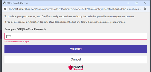 - On the page the customer is redirected to, the customer enters the OTP that was sent to the customer's mobile device and then presses ‘Validate’.