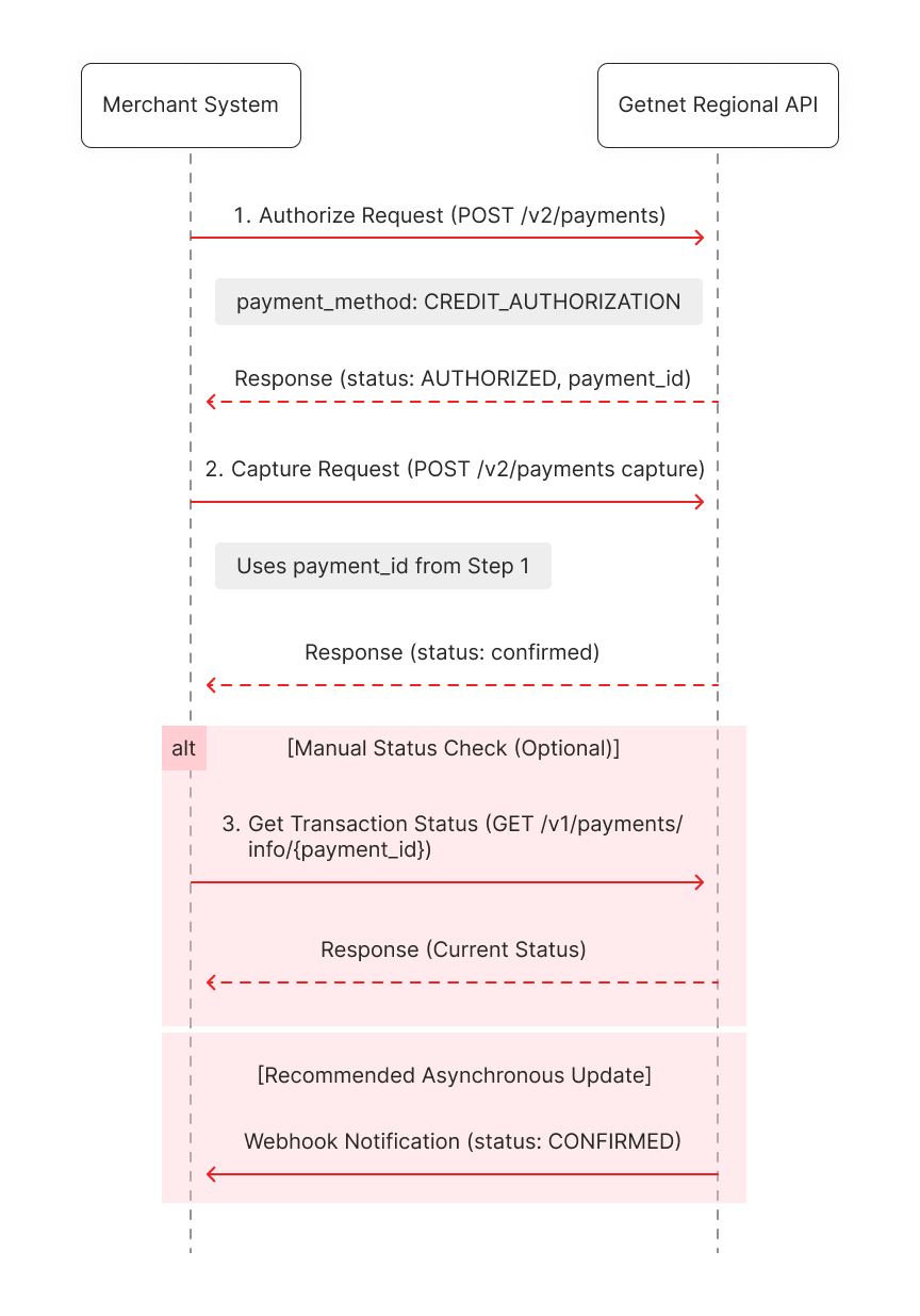 To help visualize the two-step payment process, the following sequence diagram illustrates the interactions between your system and the Getnet Regional API. It covers the initial authorization, the subsequent capture, and the two methods for verifying the final status.